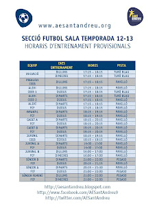 Podeu consultar els horaris provisionals d’aquesta temporada i en cas de dubte podeu contactar amb el Coordinador de la secció, Toni Cerdan, o els vostres entrenadors per tal d’assegurar el dia i hora de convocatoria.